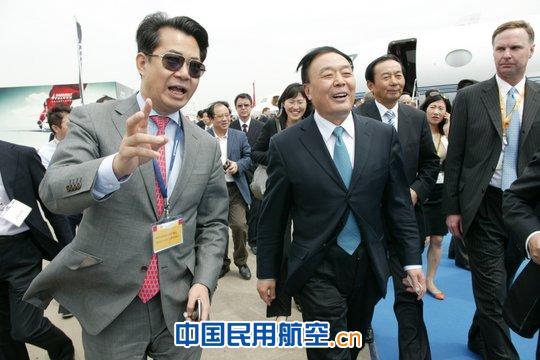 民航局局长李家祥、副局长夏兴华等一行在巴西航空工业公司大中华区总裁关东元的陪同下参观巴航工业公务机 摄影:安利国