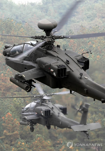 资料图片:正在进行训练的驻韩美军的阿帕奇直升机(韩联社)