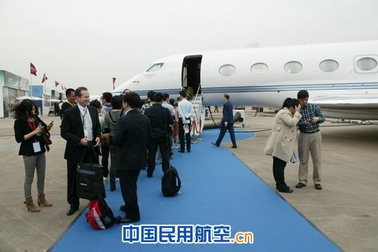 速度最快的湾流飞机前,参观的人排长队。摄影:安利国