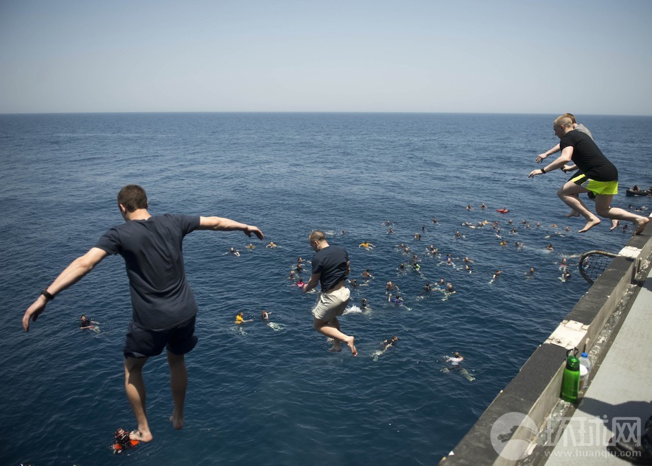 据美国海军网报道,当地时间5月12日,正在阿拉伯海北部执行部署任务的美国海军尼米兹级航空母舰艾森豪威尔号(CVN 69)组织舰员进行跳水游泳训练。这不仅仅是一项休闲娱乐活动,也是训练舰员在紧急情况下的跳水逃生能力。