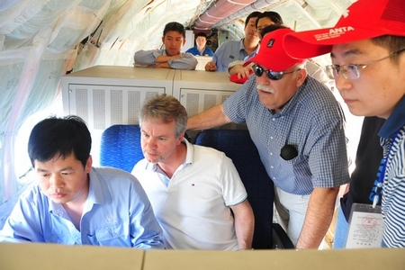 FAA、CAAC审查代表在飞机机舱内审查试飞相关数据。