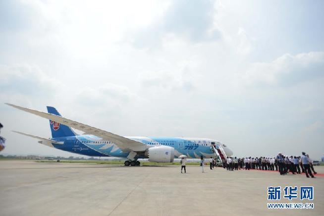 6月2日,南方航空公司在广州白云机场举办接机仪式,宣布中国引进的首架波音787梦想飞机正式启动运营。当日,我国引进的首架波音787梦想飞机飞抵广州。 新华社记者 王建华 摄