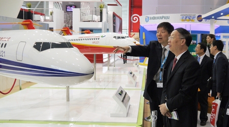 在中国商飞公司展区,苏波认真察看了C919大型客机混合级布局以及ARJ21-700飞机混合级、全经济级、行政机和公务机布局模型,听取了公司两大型号的最新研制进展、能力建设、人才队伍建设、国际合作、民机产业体系建设等方面情况的汇报。苏波表示,中国商飞公司成立5年来取得的成绩令人鼓舞,工信部将一如既往地支持中国商飞公司的发展建设,希望中国商飞公司再接再厉、奋力拼搏,争取早日取得大型客机项目的成功。