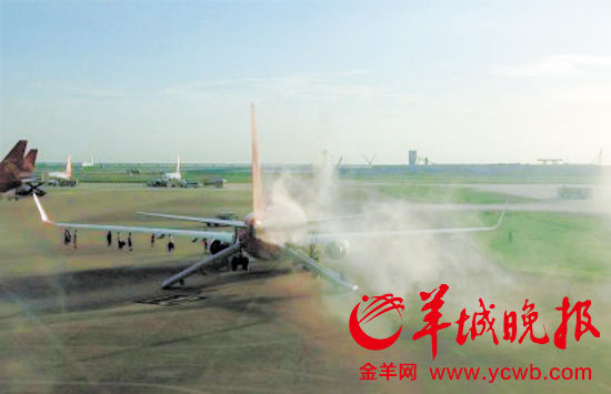 飞机尾部冒出浓烟,应急滑梯全部放下,乘客被疏散到停机坪