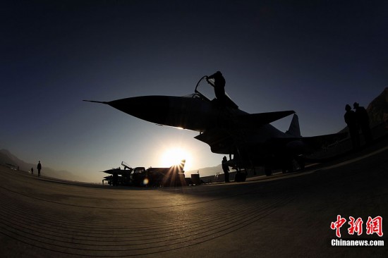 1月31日,雪域高原阳光明媚,万里无云。驻藏空军某军用机场战鹰列阵,车辆奔流,战士们在紧张有序中拉开龙年新春首飞的序幕。图为晨曦初露,机务人员正在紧张准备战鹰。中新社发 刘应华 摄 图片来源:CNSPHOTO