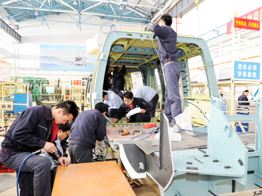今年是中航工业哈飞与欧直合作联合研制的直15/EC175直升机由科研转小批生产的第一年。为确保全年任务完成,哈飞直15线上的干部职工,与欧直专家密切协作。面对时间紧迫、人力不足、任务繁重、难度大等困难,哈飞针对关键节点、关键任务,集中人力进行突击。从10月2日开始,实行“7·12”工作制,职工们每天工作到晚上10点钟;同时做好后勤保障工作,确保职工集中精力完成任务;在奖金分配上,哈飞制订了倾斜政策,调动了职工大干直15的积极性。图为工人正在装配直15。