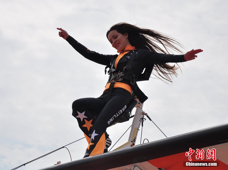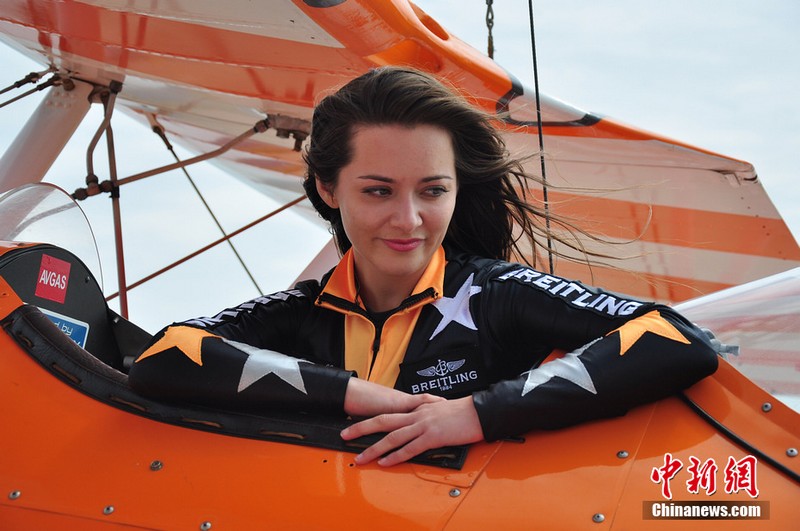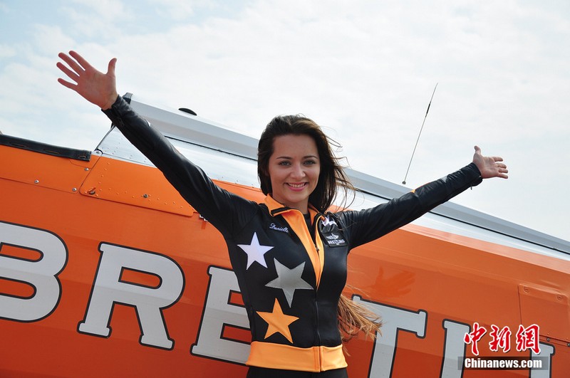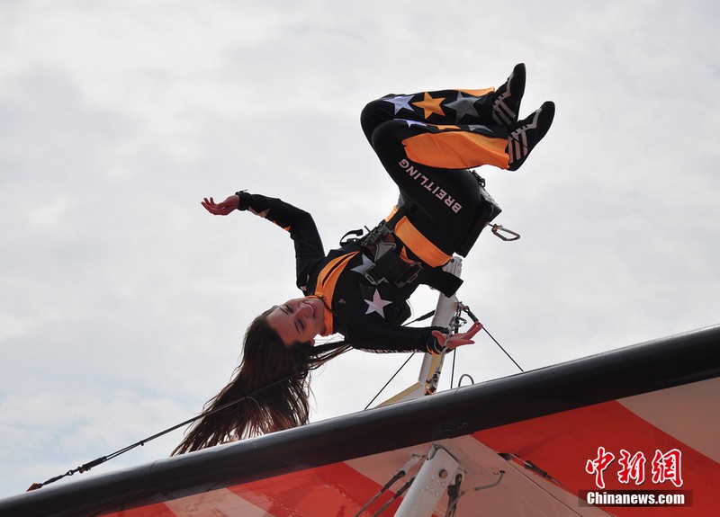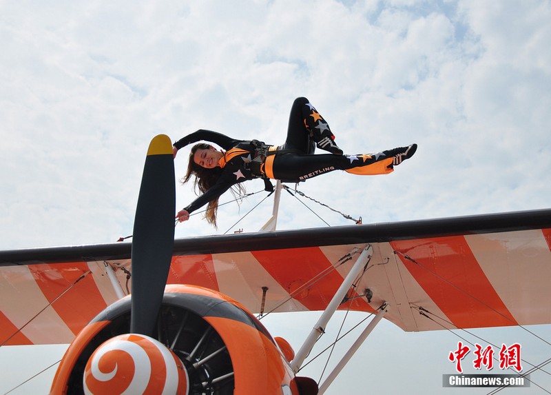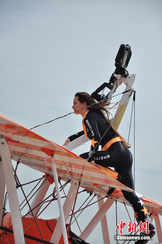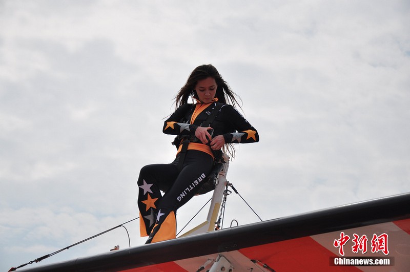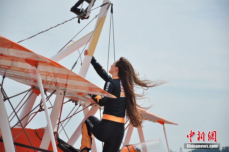 11月11日,欧洲“百年灵”机翼行走飞行表演队的美女表演者在地面停放的飞机上进行了表演动作展示。