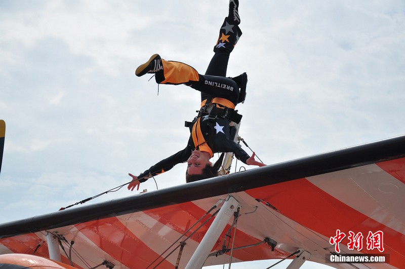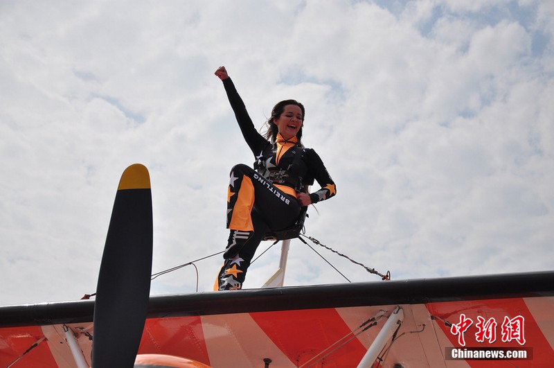 机翼上的芭蕾:美女特技演员机翼上跳舞