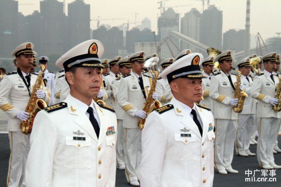 中国第一艘航空母舰辽宁舰舰长张峥(前右)政委梅文(前左)