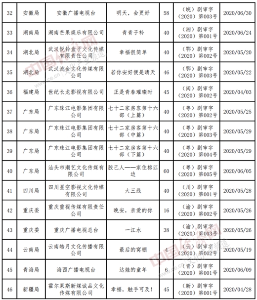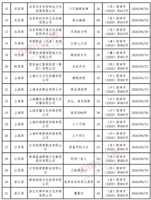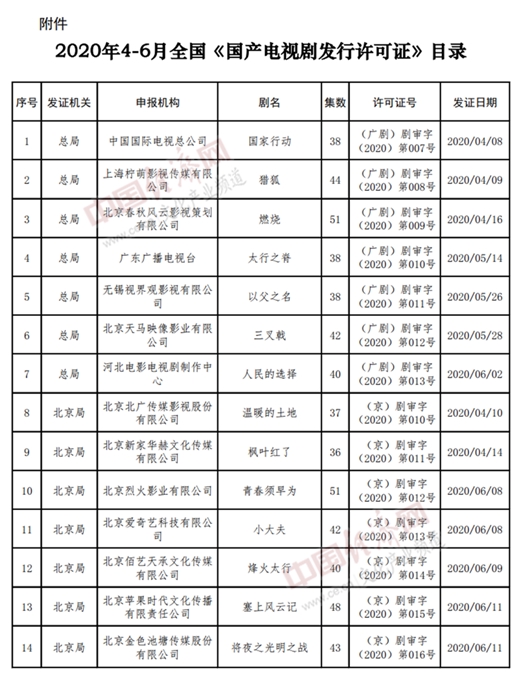 以下为2020年4至6月全国《国产电视剧发行许可证》目录: