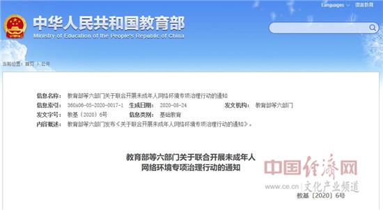 经济日报-中国经济网北京8月27日讯 日前,为营造良好安全的未成年人网络环境,教育部、国家新闻出版署、中央网信办、工业和信息化部、公安部、市场监管总局等六部门发文,联合开展未成年人网络环境专项治理行动。