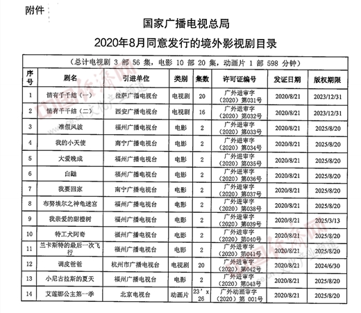 经济日报-中国经济网北京9月24日讯 近日,国家广播电视总局办公厅公布2020年8月全国引进境外影视剧有关情况,《我的小天使》《大爱晚成》等10部电影及《情有千千结》等3部电视剧作品入选《2020年8月同意发行的境外影视剧目录》。