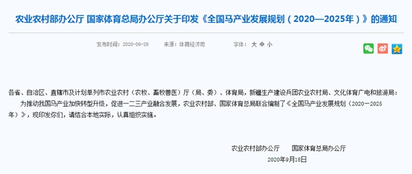 到2025年,我国现代马产业发展的框架和体系初步形成,一二三产业融合发展格局初步形成,马产业经济效益和社会效益大幅提升,形成相对完备的现代化育种、高效养殖、诊疗保健、疫病防控、调教训练、性能测定、竞赛表演、健身休闲、文化旅游、产品加工和产业服务体系。