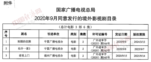 经济日报-中国经济网北京10月27日讯 26日,国家广播电视总局办公厅公布2020年9月全国引进境外影视剧有关情况,由宁夏广播电视台引进的《刺猬的优雅》《杜什一家3》,福州广播电视台引进的《老爸上门》等3部电影,入选《2020年9月同意发行的境外影视剧目录》。