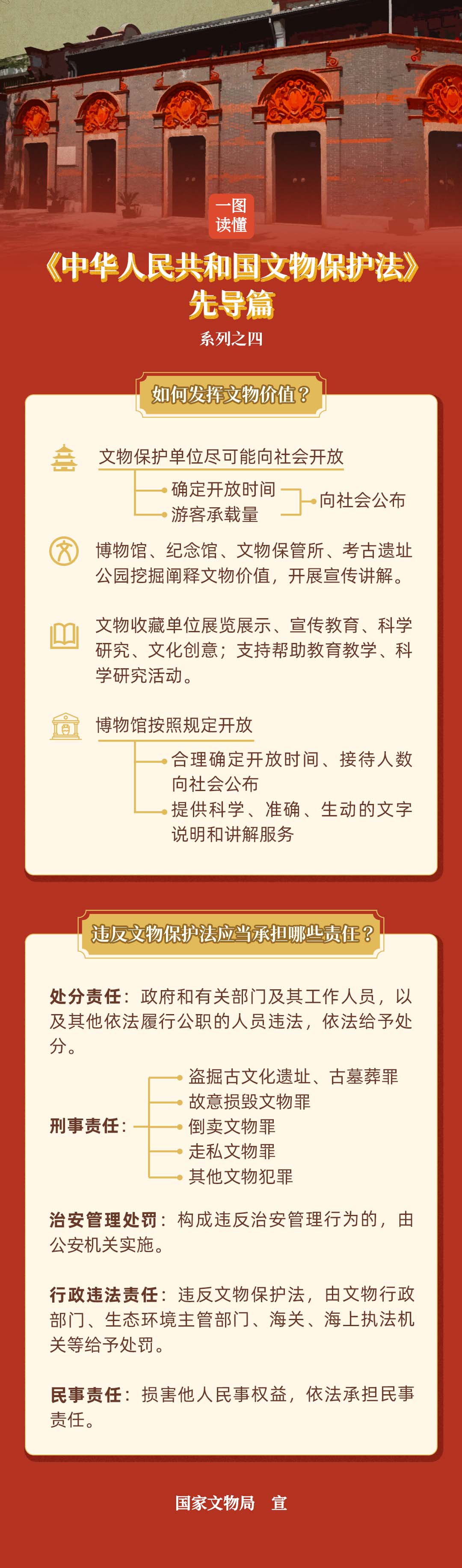 《中华人民共和国文物保护法》颁布于1982年,是我国文化领域第一部法律,是文物工作的基础性、综合性、系统性、统领性法律。2024年11月8日,《中华人民共和国文物保护法》修订公布,自2025年3月1日起施行,标志着我国文物保护工作进入依法治理的新阶段。